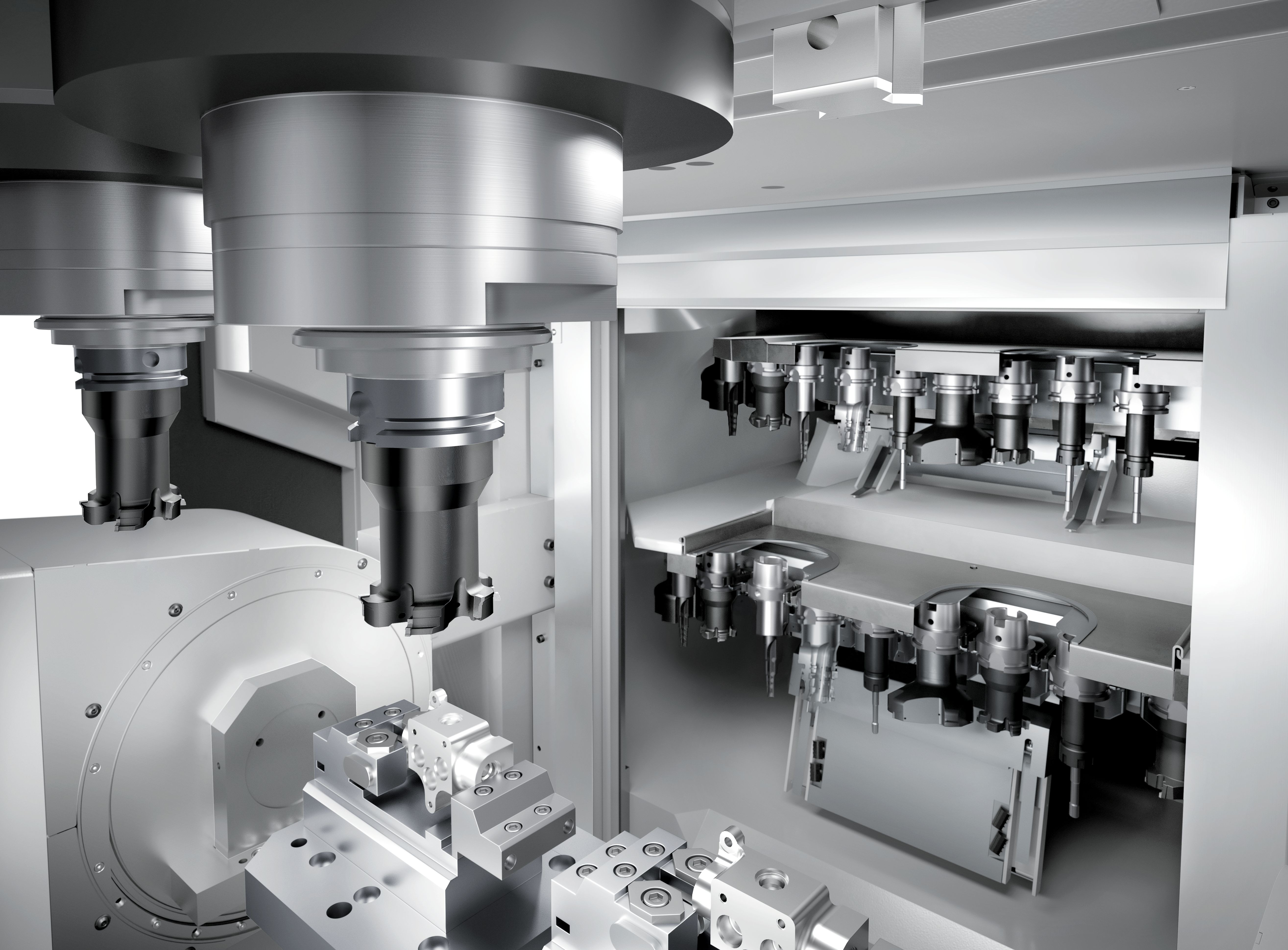A fixed double spindle allows simultaneous machining on two spindles to boost efficiency and reduce cycle time.